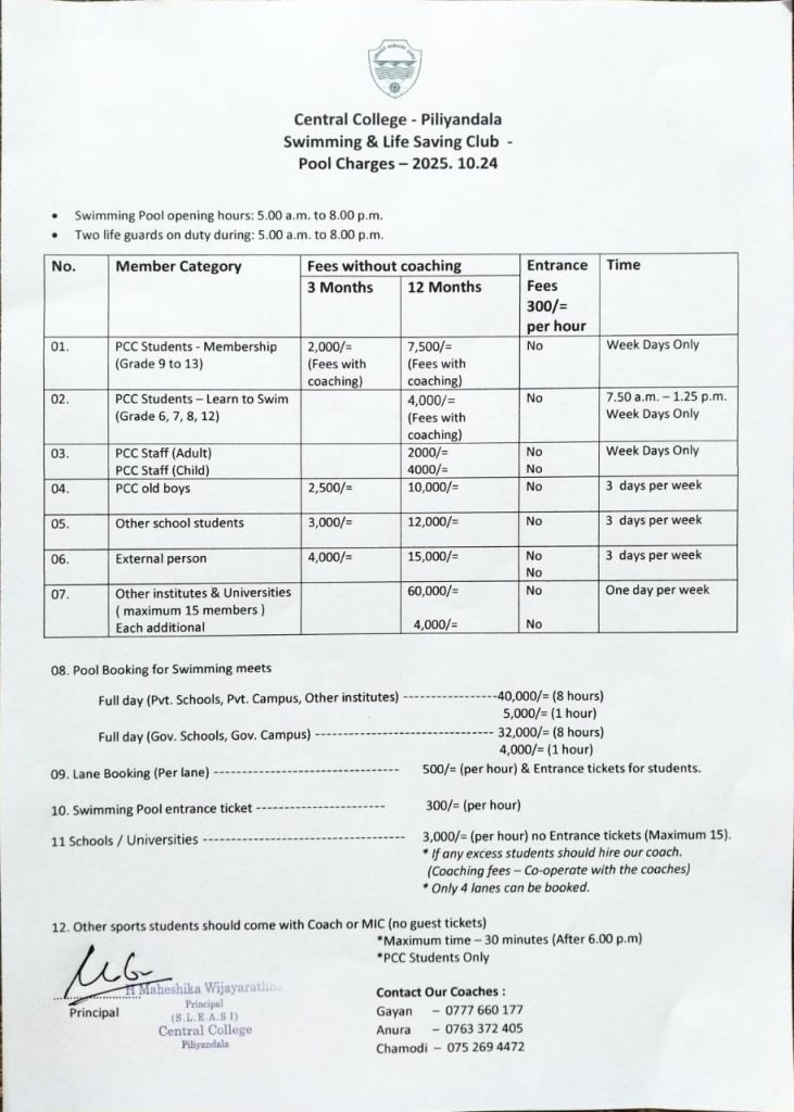 Get ready to make a splash! The Central College - Piliyandala Swimming & Life Saving Club is thrilled to announce the pool charges and membership options for the upcoming season, effective October 24, 2025.